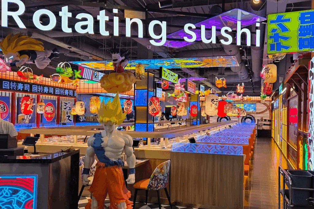 Más de 130 platos japoneses en una cinta giratoria sin fin en un local decorado como un anime con luces de neón, farolillos y figuras de Dragon Ball a tamaño real.