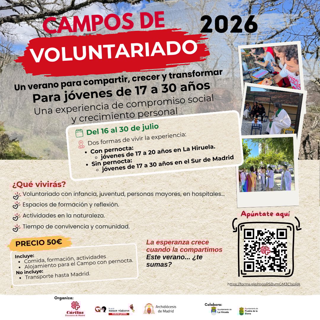 Cáritas Madrid lanza los Campos de Voluntariado 2026 del 16 al 30 de julio bajo el lema "La esperanza crece cuando la compartimos". Dos modalidades: con pernocta en La Hiruela (17-20 años) y sin pernocta en sur de Madrid (17-30 años). Coste: 50€ incluye actividades, formación, manutención y alojamiento.