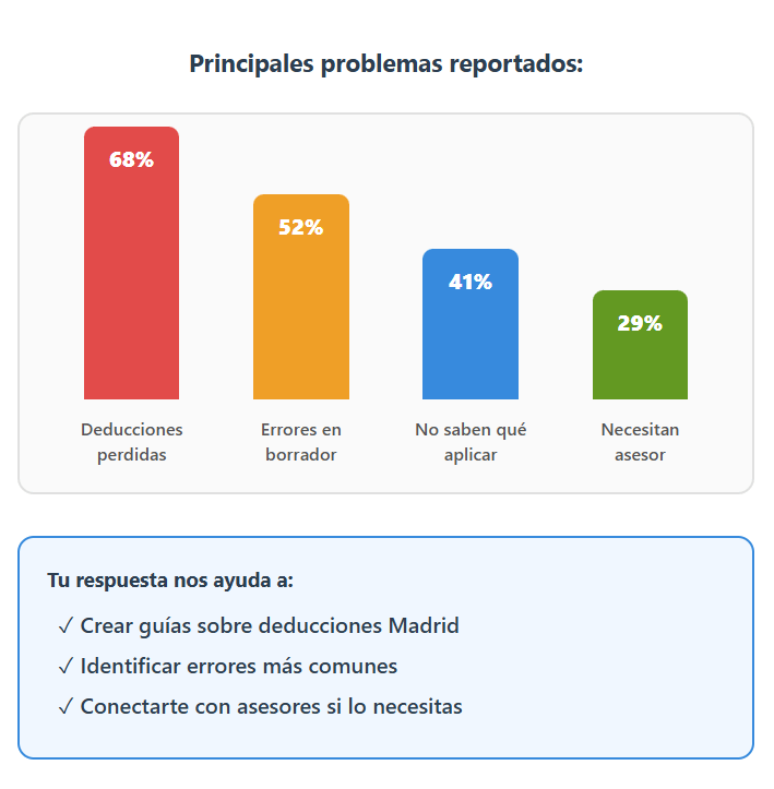 Los primeros datos de la encuesta son claros: 7 de cada 10 madrileños pierden dinero en la Renta por desconocimiento de deducciones que no aparecen en el borrador. Guardería, discapacidad, alquiler jóvenes o mejora energética pueden devolverte hasta 1.000€. ¿Estás en ese grupo? Completa la encuesta (30 segundos) y descúbrelo. También hablamos del día libre pagado por mudanza que es ley, la excedencia de hasta 3 años por cuidado de hijos, y el nuevo tardeo en Gran Vía con pizza gratis.