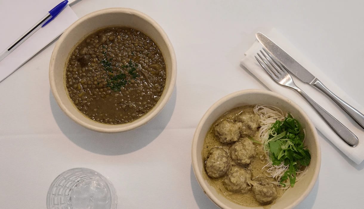 Treze y My Basket lanzan un menú del día para llevar disponible solo hasta este viernes. Dos platos: lentejas con setas y albóndigas al curry verde con fideos vermicelli por 18,70€. Recogida en Santorcaz 4, Chamartín (10:00-15:00) o pedido por Glovo. Creado por Blanca Herrero y Saúl Sanz (chef de Treze). Solo de lunes a viernes mientras dure.